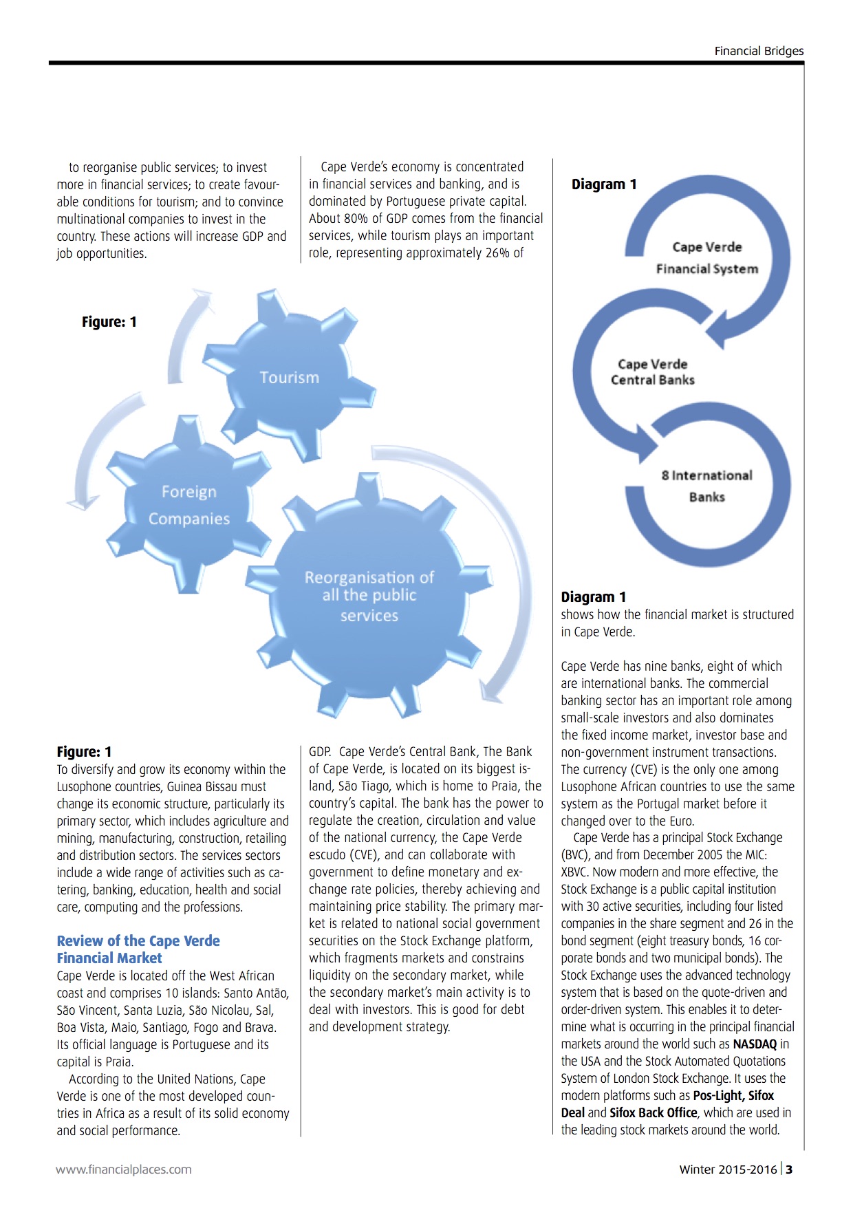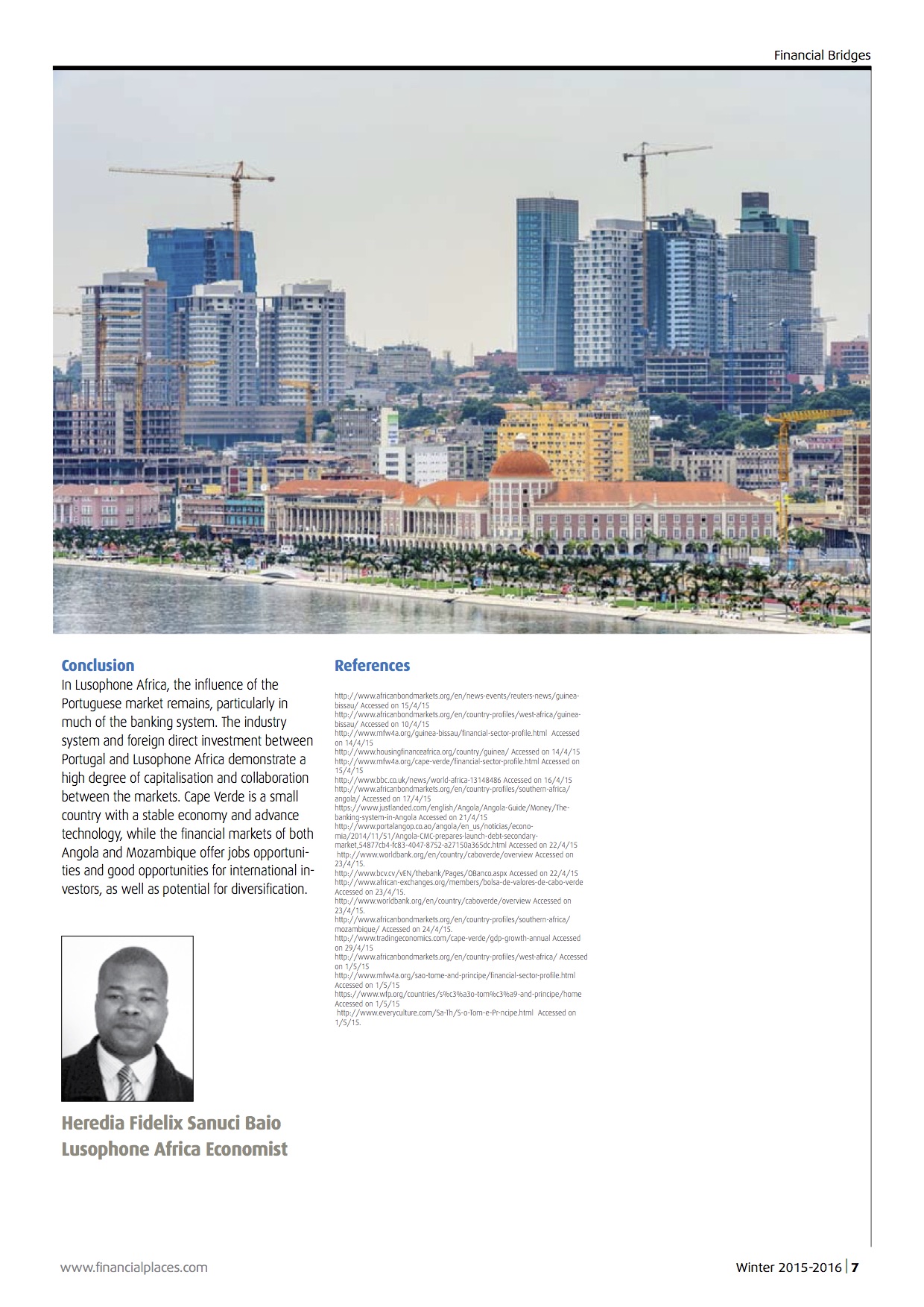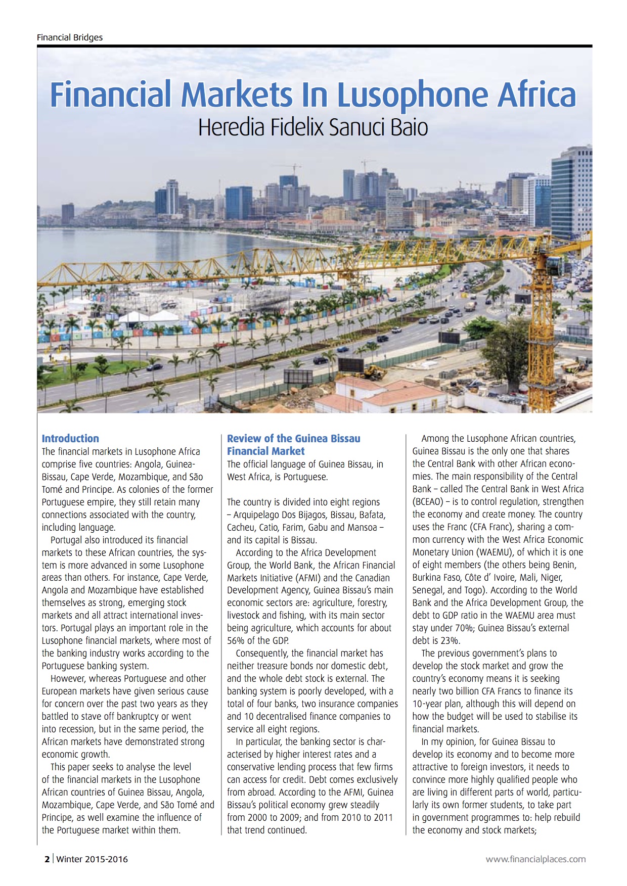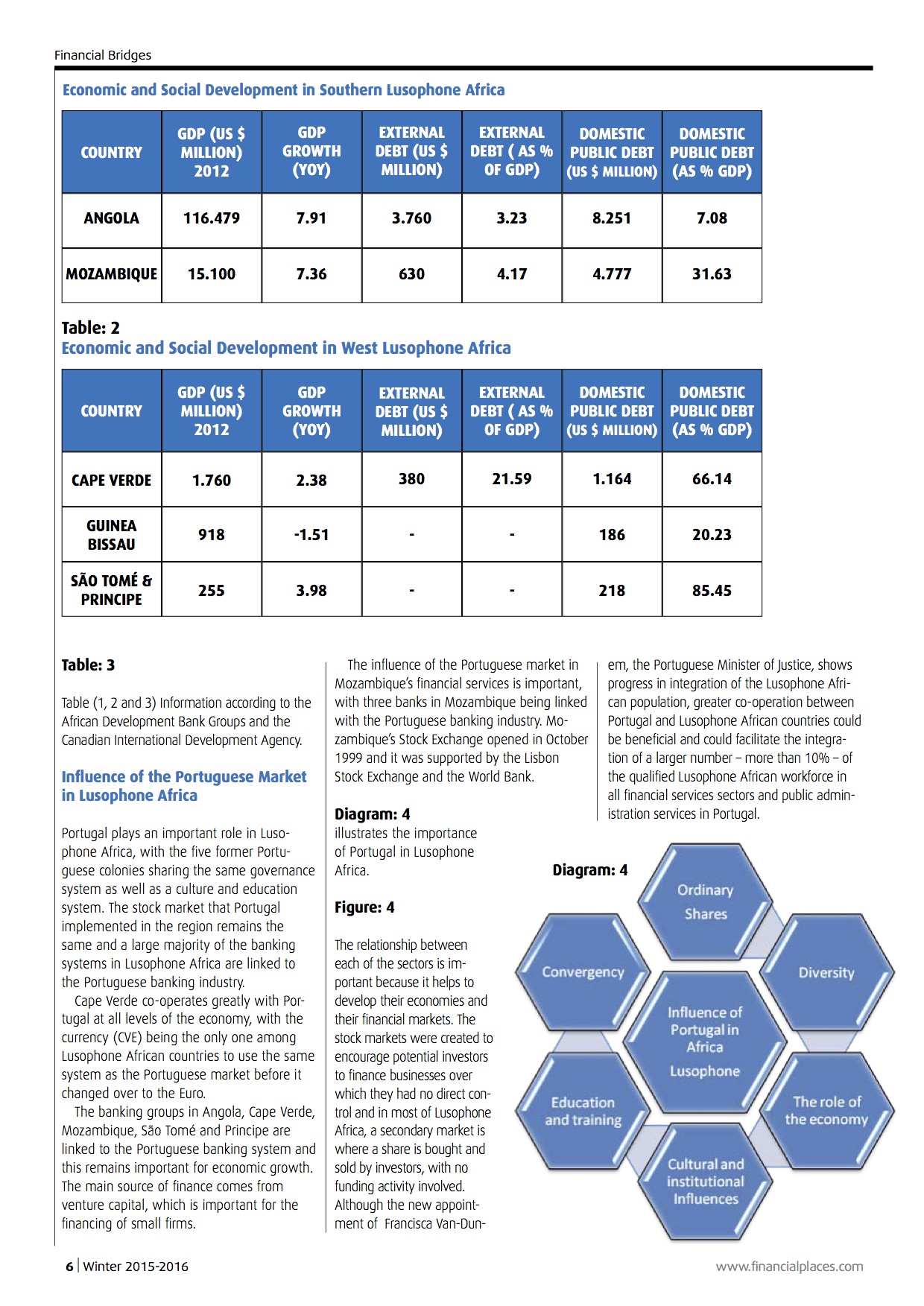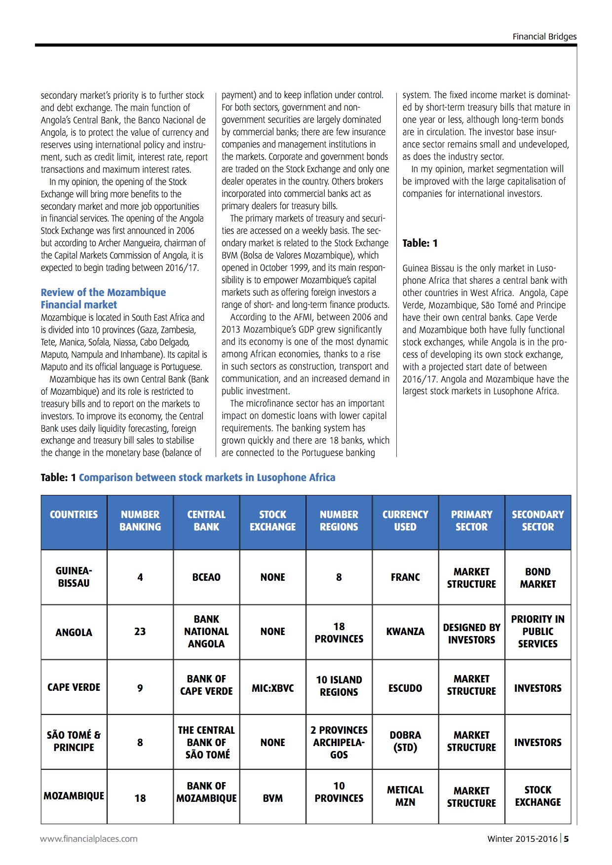 The financial markets in Lusophone Africa comprise five countries: Angola, Guinea- Bissau, Cape Verde, Mozambique, and São Tomé and Principe. As colonies of the former Portuguese empire, they still retain many connections associated with the country, including language.